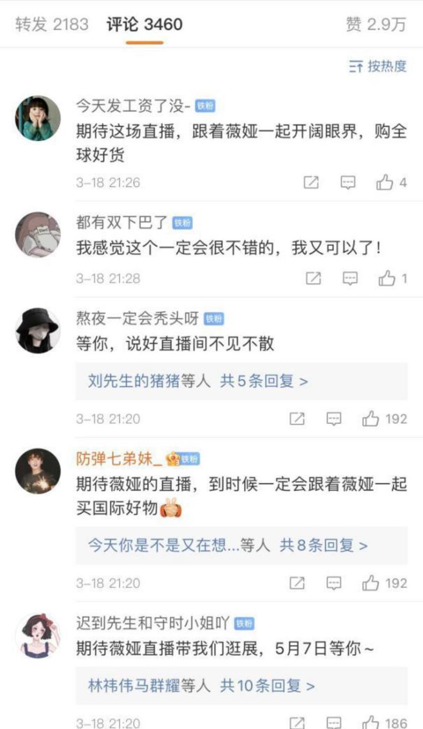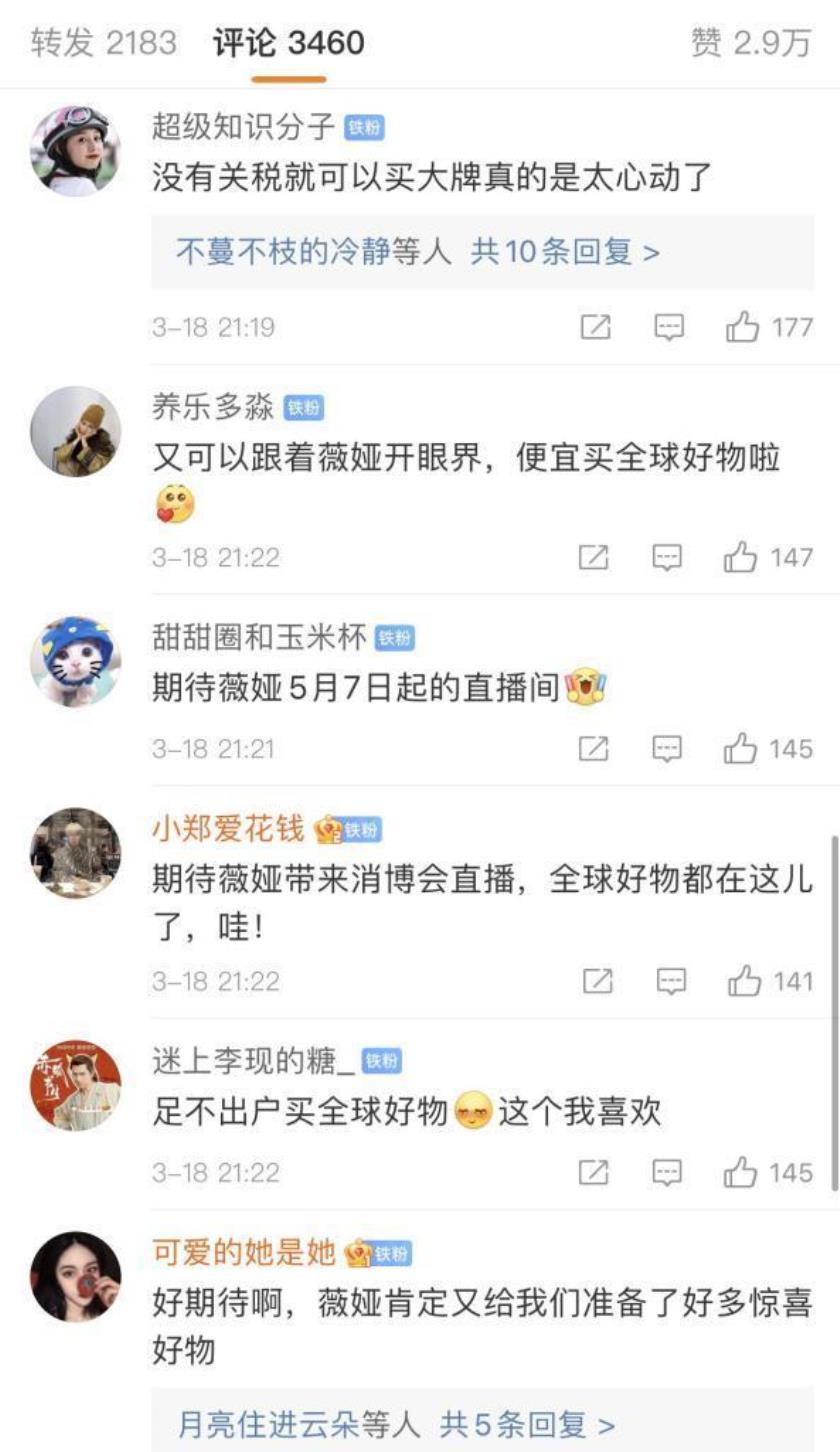 此次薇娅受聘为“消博会公益宣传大使”的消息一出,消博会官方微博就已经有不少薇娅粉丝留言:“想买大牌包包”“期待薇娅带来的划算好物”“正愁找不到靠谱代购,这下薇娅都给安排了”......影响力可见一斑。