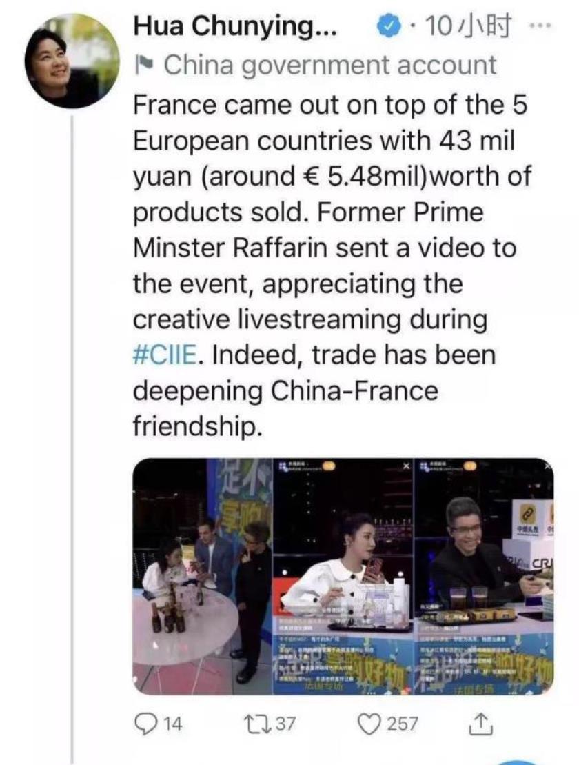 进博会期间,央视新闻也在薇娅直播间举办了俄罗斯、法国、西班牙、德国欧洲四国好物直播专场,多个产品瞬间“秒光”。西班牙驻华大使德斯卡亚走进直播间,成为有史以来第一个在电商直播间亮相的外国驻华使节。就连中国外交部发言人华春莹也在推特上为这场特殊的中外经贸合作点赞。
